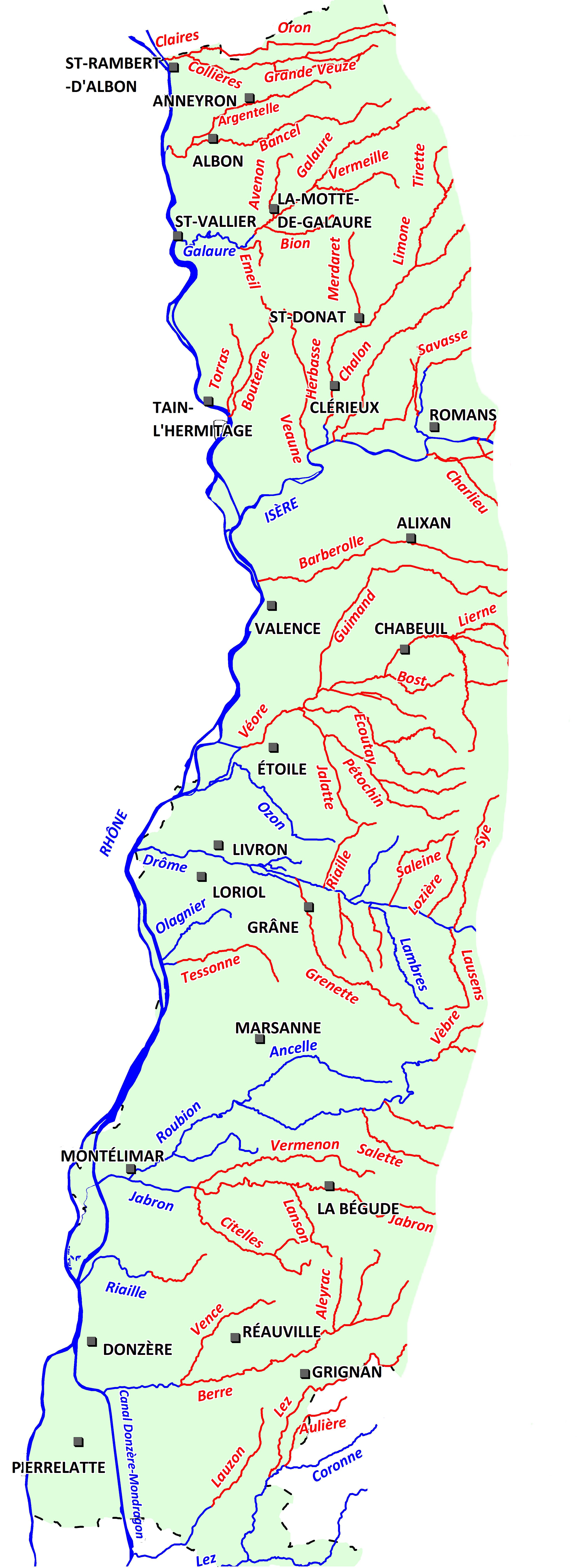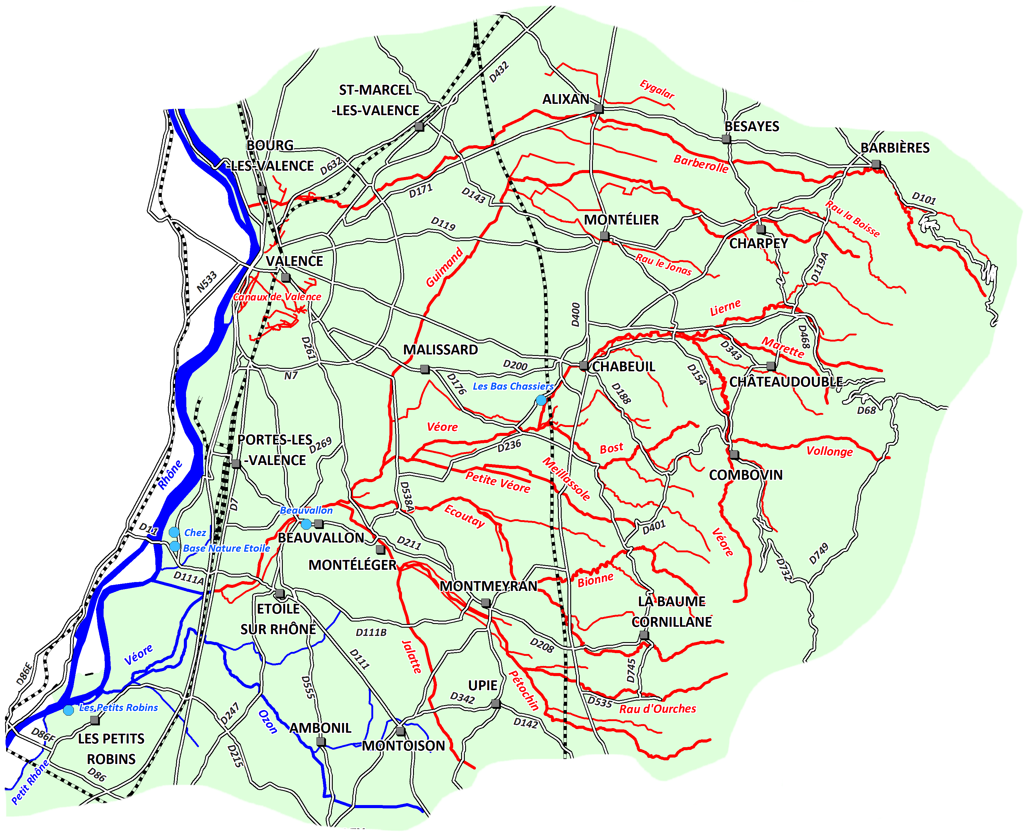 Cette plaine alluviale s’étendant sur la rive gauche du Rhône, formée par les basses vallées de deux cours d’eau se jetant dans ce fleuve, l’Isère au nord et la Drôme au sud. Malgré son petit gabarit, la Véore et ses affluents, alimentés par les contreforts du Vercors, abritent d’impressionnantes truites fario. L’étang des Bas Chassiers permet de s’essayer au black bass. Site agréable et idéal pour débuter à la pêche à la ligne, il fera le plus grand bonheur des enfants. Les canaux de Valence, au fort patrimoine naturel, raviront les adeptes du « street fising ».